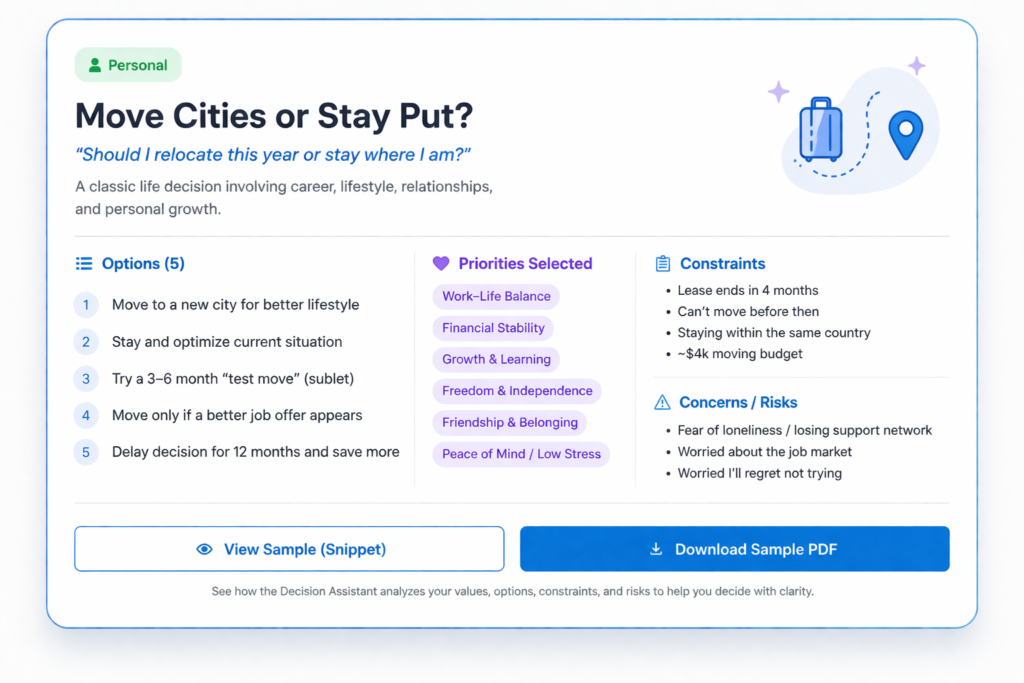 Enter your options and what matters most to you. The tool automatically analyzes each choice based on your priorities and generates alignment scores, charts, and a clear breakdown showing the “why” behind each score — plus a clean PDF report you can keep or share.