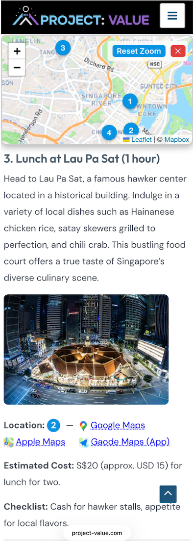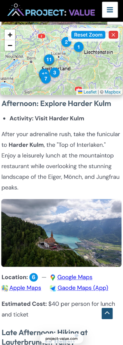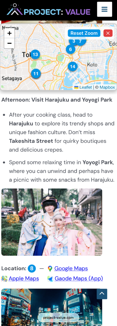 Enter your destination and preferences. The tool automatically generates a tailored itinerary with rich activity descriptions, photos, a floating interactive map with numbered pins, direct navigation links (Google/Apple/Gaode), and a polished handy PDF itinerary you can keep or share.